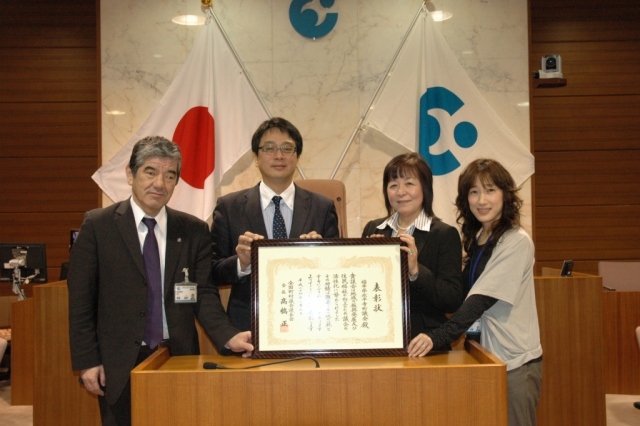 退職日に議場にて記念撮影 (向かって右から2番目:吉田さん)
