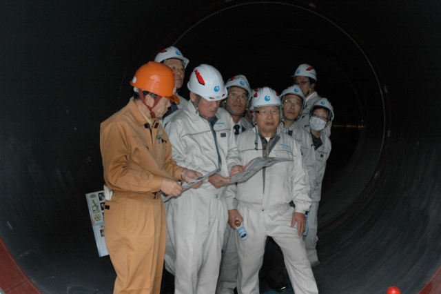 工事は、九頭竜川下流農業水利事業計画に基づき、左岸幹線用水路(芝原用水路)を内径Φ2,800mmの管水路にするものです。この工事の進捗状況を見学しました。「国営農業用水再編対策事業」で鳴鹿大堰より取水している地域の開水路をパイプライン化し、維持管理の軽減を図るとともに、パイプライン化によって創出される用水を利用し、周辺地域への水源転換等農業用水の再編を行い、用水の安定供給を図ります。